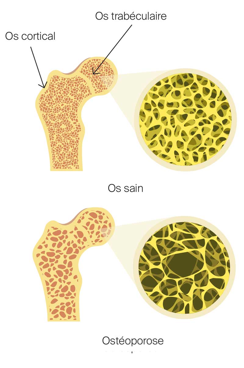 La perte osseuse due à l’ostéoporose touche aussi bien l’os cortical que l’os trabéculaire. Ce dernier est décomposé plus rapidement en raison de son activité métabolique plus élevée. La perte des deux structures augmente la porosité et contribue à la fragilité osseuse.3